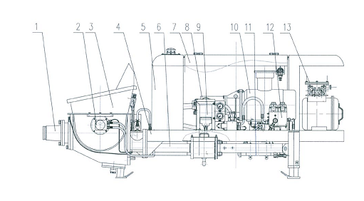 1.出料口 2.攪拌機(jī)構(gòu) 3.料斗 4.機(jī)架 5.液壓油箱 6.泵送系統(tǒng) 7.機(jī)罩總成 8.潤(rùn)滑系統(tǒng) 9.動(dòng)力系統(tǒng) 10.防暴電動(dòng)機(jī) 11.液壓系統(tǒng) 12.水冷卻部件 13.電器總成