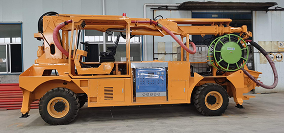 3、同步速凝劑添加采用進(jìn)口軟管泵,液壓馬達(dá)驅(qū)動(dòng),電比例流量閥調(diào)節(jié)轉(zhuǎn)速以達(dá)到調(diào)節(jié)流量的目的,液晶顯示和觸屏設(shè)置速凝劑添加比例,且在屏幕和器上均可隨時(shí)修改設(shè)置,速凝劑的添加量緊隨砼的泵送量同步變化而保持添加比例按設(shè)定值運(yùn)行,這些均由可編程控制器控制。由此可實(shí)現(xiàn)對(duì)速凝劑添加量的控制,以達(dá)到效果,回彈和節(jié)約速凝劑的目的。機(jī)器上配有容積為1.0m³的耐腐蝕塑料材質(zhì)的速凝劑容器,速凝劑軟管泵也可從外部容器中抽吸速凝劑,根據(jù)實(shí)際情況可方便地進(jìn)行切換。